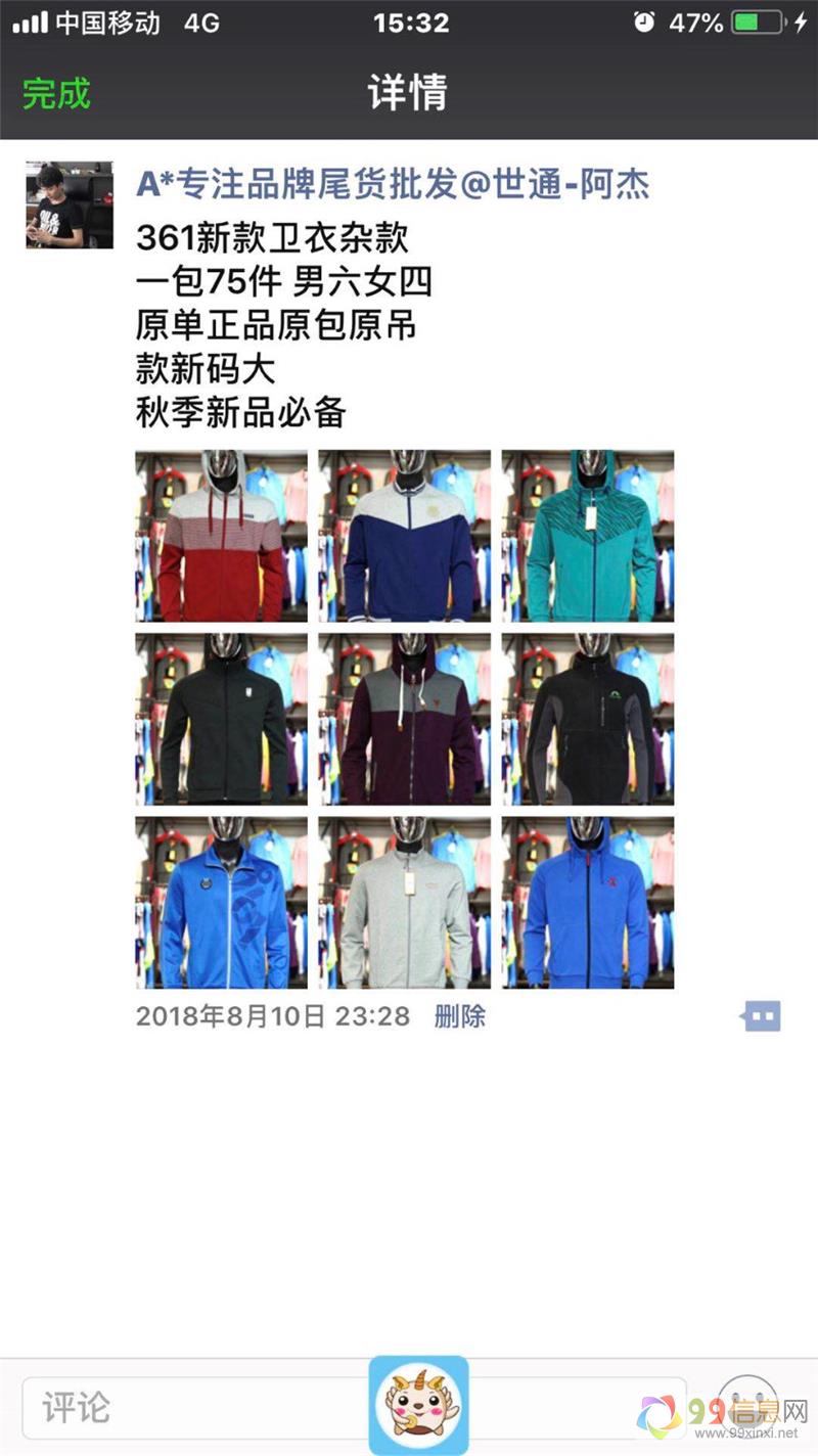 安踏运动品牌服装尾货批发网世通服饰性价比高价格也便宜,来源www.99xinxi.net广州世通鞋服商行秉承“质量、信誉”99xinxi.net的原则,愿与全国各地朋友携手共同建立长期合作关系、共谋发展,共创大业!世通鞋服商行商品远销全国各地、物流运输方便快捷,省去您路途奔波之劳累,订货付款后我们将负责运送至货运站,在线阿里旺旺及QQ可能没有及时回复的情况下,万望您致电咨询相关事宜世通鞋服商行经营各大知名品牌:运动类有李宁、安踏、乔丹、匹克、361°、德尔惠、鸿星尔克、金莱克、贵人鸟、金鸡……等99信息网www.99xinxi.net,商务休闲类劲霸、七匹狼、利郎、才子……等国内一二三线品牌.世通鞋服商行与李宁,七匹狼两家品牌公司已签订战略合作.欢迎www.99xinxi.net特许授权世通服饰商行全权经营代理公司特卖场.欢迎服装经营爱好者一起加盟我们的特卖场.我们将为你打造一个属于您的服装人生舞台世通鞋服商行其商品全部与国内、国际上千家品牌服饰厂家建立长期合作关系,专业经营各种订单尾货,计划库存.基本控制在原品牌商品价格的0.5折9_9_x_i_n_x_i_n_e_t-1.5折,部分商品与原品牌商品上市相隔时间只有20天左右,极大刺激顾客的消费欲望。众多商品无法一一列举及上传网站。